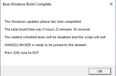 The imported scheduled tasks run in the system context, the default behavior for running a PS script via a scheduled task in the system context means the logged in user won’t the output of the script or even the windows update UI, which isn’t ideal. So, to present this info to the logged in user, my co-worker Jon Pitre recommended I have a look at an SCCM component called ServiceUI.exe. Launching Powershell via this exe will show the output to the current user, neat! In this way, the various stages of the packer build can be shown to the user. There are several auto logons set for the build to cover the reboots after windows updates have applied. Once it’s determined by the Monitor-WinUpdates.ps1 script that there are no more updates to apply, the related scheduled tasks will be disabled, and final window to the user will be shown that indicates the total build time, and that you’re ready to join the machine to your AD domain or run whatever post base build actions you want to for your client environment