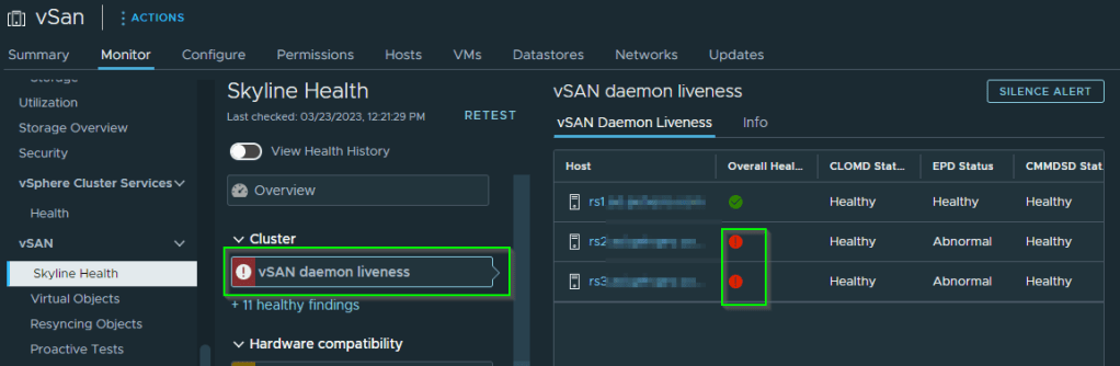 Note: If you run through the above process on vSan enabled ESXi hosts, it will log the following within Skyline under Cluster sub-checks, related to vSan daemon liveness, and a service called EPD. Checking the following KB from VMware, “EPD is used to check for component leakage when objects are deleted in a vSan datastore”