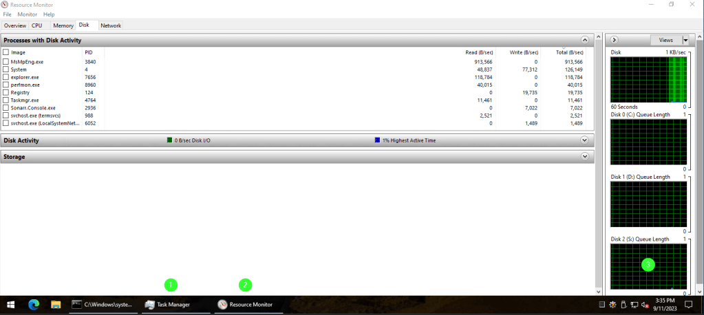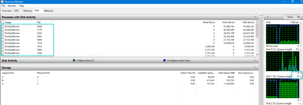 CrystalDiskMark is a good synthetic storage benchmarking tool. I generally like to run it on any new hard drive I buy for my home lab hardware, or even my laptops / primary desktop. Towards the start of a new Citrix project, I’ll also use it to ID the maximum theoretical speed the attached storage is capable of. It should be noted, running this tool on a real production system will impact over-all performance (you can see below my disk queue shot up to 10) as the various DiskSPD64.exe processes were spawned by the tool while it ran. So, if you’re running the tool proactively, do it after-hours. If you’re running it during an unplanned outage, go for it, nothing to lose now! It takes about 2-3 mins to process