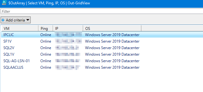My experience doing Citrix related work gave me a lot of the required skills to be able to assist with migrating over MS AD / SQL / Filer / and some application server functionality. The above code was ok, but I wanted to expand it to run online checks against the servers found, as well as put them into a table to tag for future review with the client, the final window on the code an Out-Gridview as follows