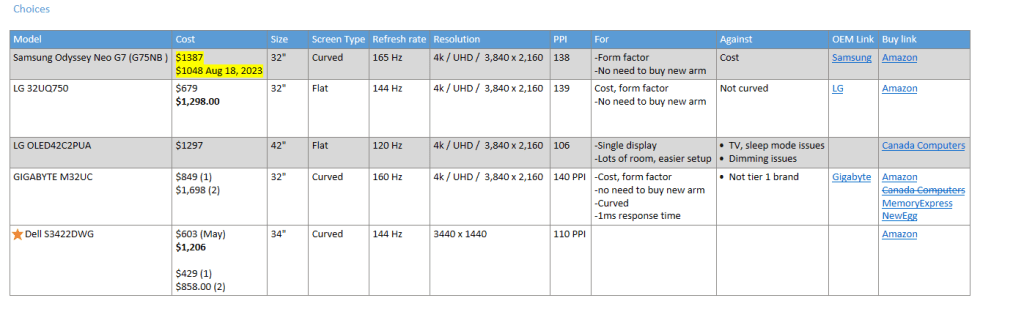 Depending on the category, I’ll add additional columns. Here’s a recent example that guided me on long-overdue monitor upgrade (see the following related blog post)