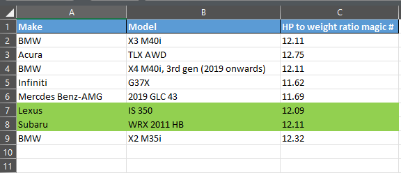 I mostly understood the difference / relationship between torque and HP, but what I didn’t understand until I’d reached the end of my test drives, was how the weight of the car against it’s HP impacted the driving experience. My final test drive was a BMW 3 series x28i. This 4 door sedan has a curb weight of 3600 lbs, but only 240 HP. So, in when driving it, it felt under-powered against the Lexus IS 350 F Sport that I had also driven that summer. After my under-whelming test drive of the BMW 328i, I went home and added a new thrust, I came up with a simple formula to explain it. Divide the weight of the car by the HP to get what I called the “thrust to weight ratio”. I went back to the top 5 cars I’ve driven from the full list of 29. Sure enough, the ones I had written “SEXY” in my excel sheet all had a similar “thrust to weight ratio” between 11 and 12. I refocused my car search , and purchased a 5-speed 2011 Subaru WRX (related blog post) in August of 2022. After some time, I realized the manual transmission life was no longer for me, so traded in the WRX for a 2017 Lexus IS 350 F Sport in January 2023 (related blog post)