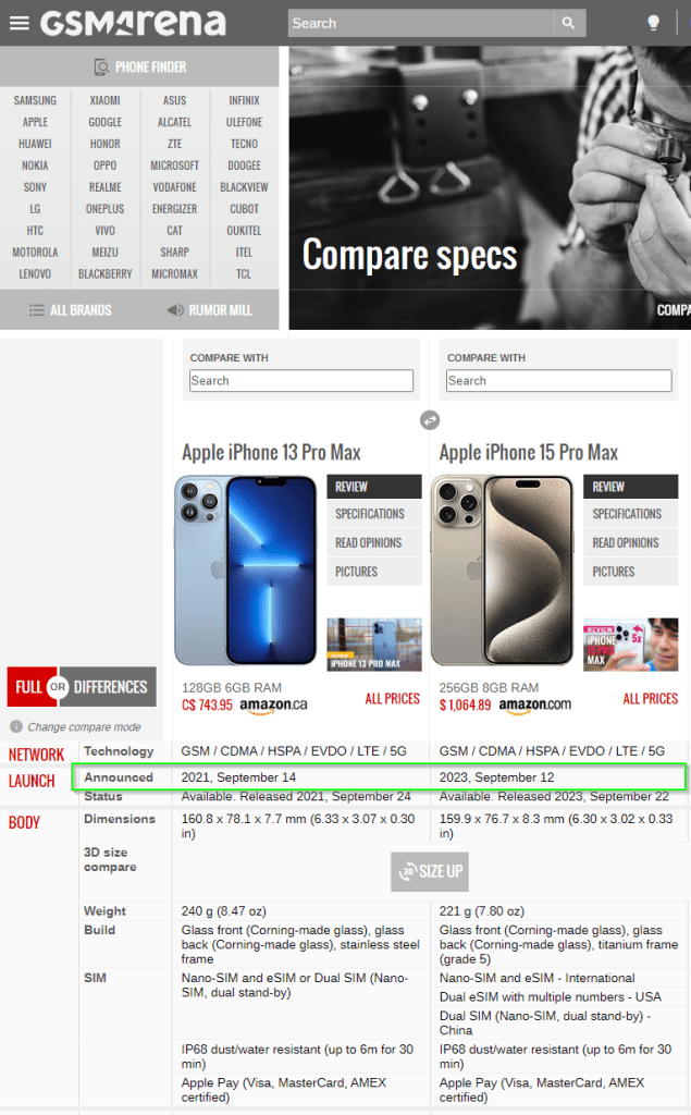 2 days later, I remembered that I had $300 USD in my Amazon US account from a gift card. I reviewed the specs of the iPhone 13 Pro Max (released 2021) vs the iPhone 15 Pro max via GSMAreana